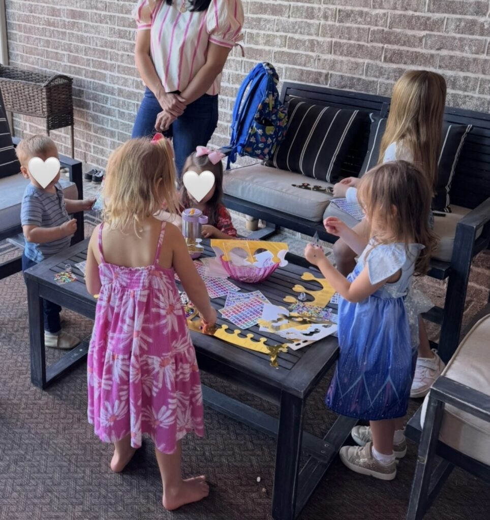 Another activity I set out was making crowns. I ordered these crown making kits (I got 2 sets) and just set them out in a bowl outside and the kids loved it! It was perfect for this age as they are learning how to spell their name. The kids put the little stickers on spelling their name and jewels were everywhere ◡̈
