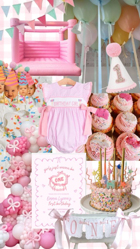 Girls just wanna be one was our theme. I loved it, it’s not overdone, and was so fun! Bow themes and bow parties are really “in” right now so I had a really easy time finding decor. I did pink as the main color (of course!) with pops of funfetti / traditional party colors. Here is the inspiration board I made: