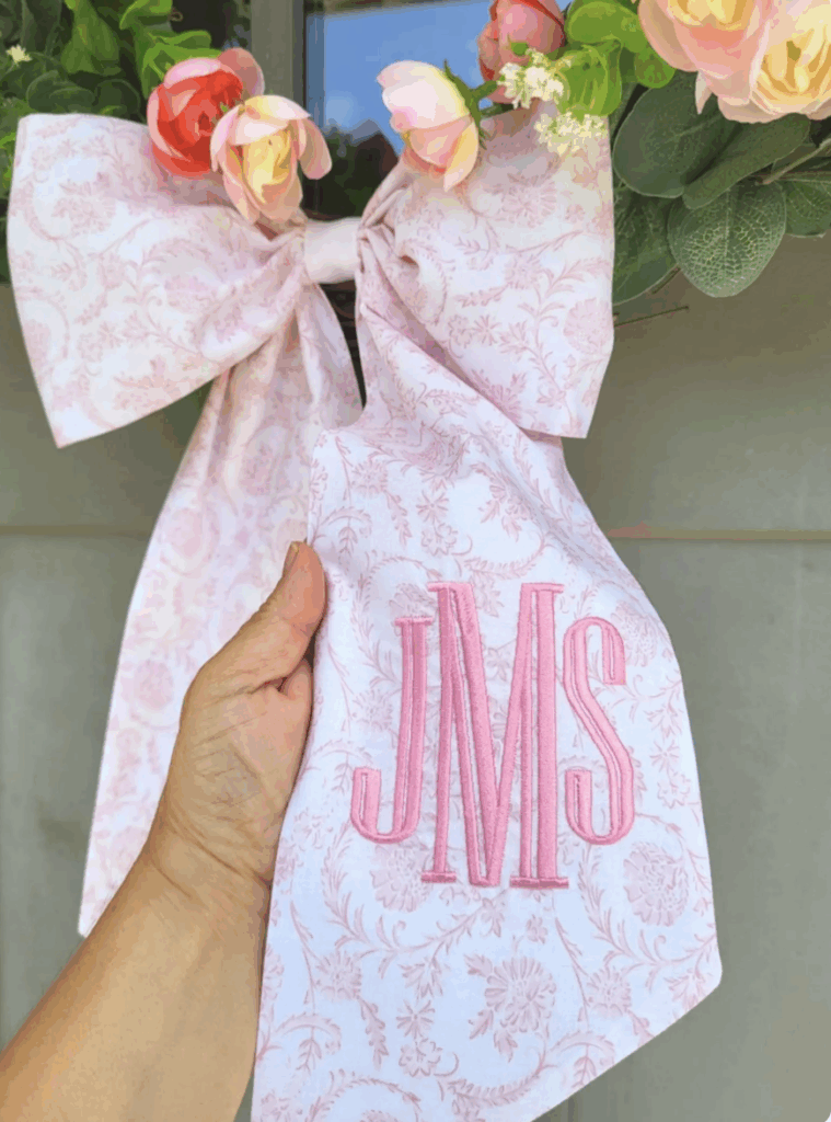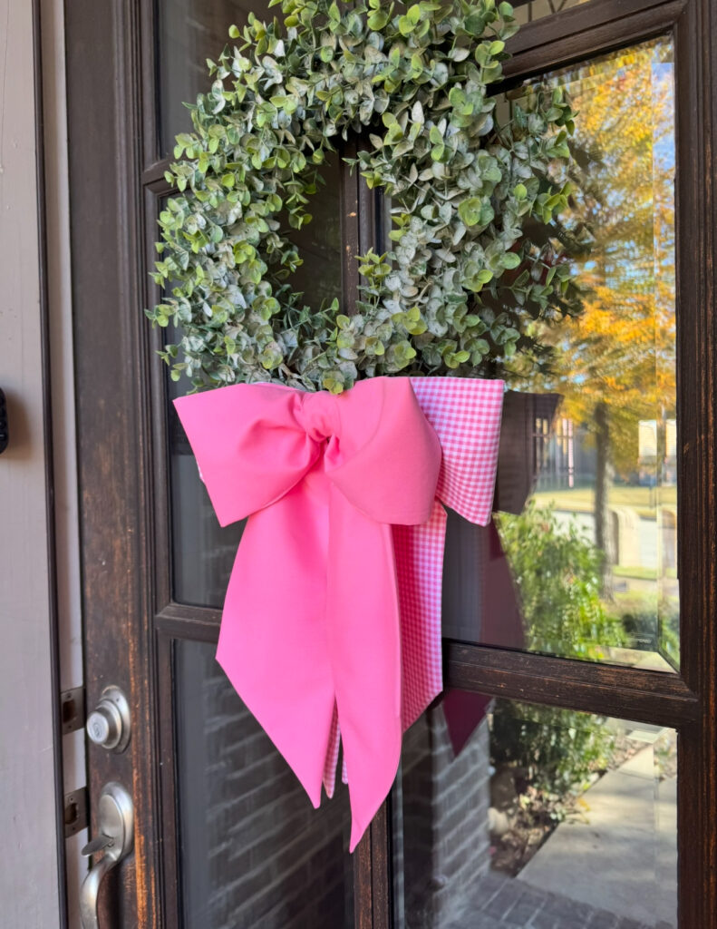 My mom sews, so I asked her to make this bow to hang on a wreath on our front door for the party! I also plan to use it for the month of February for Valentine’s Day and my birthday. I originally found a bow on Etsy that I loved but didn’t have $75 to spend on it! (Update: It looks like it is sold out, but here is another cute one from the shop!)