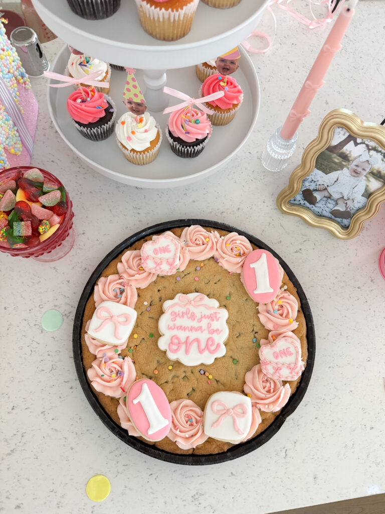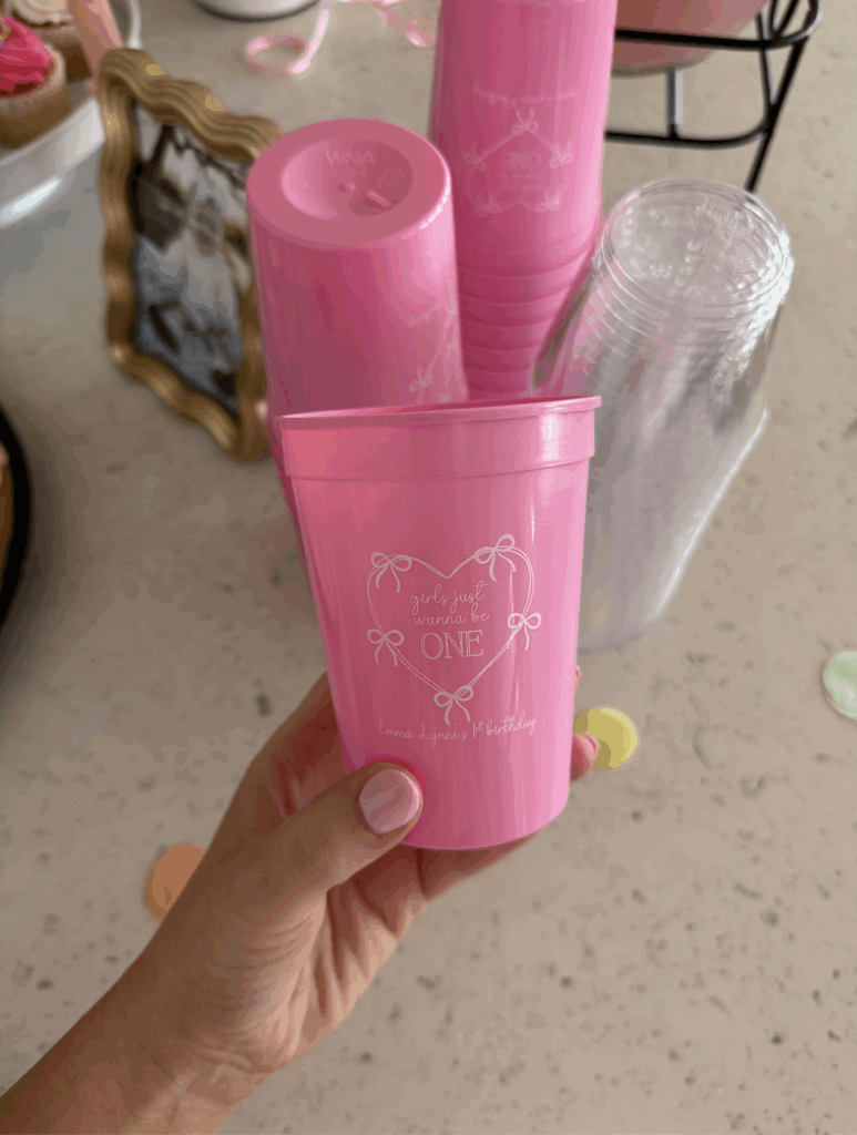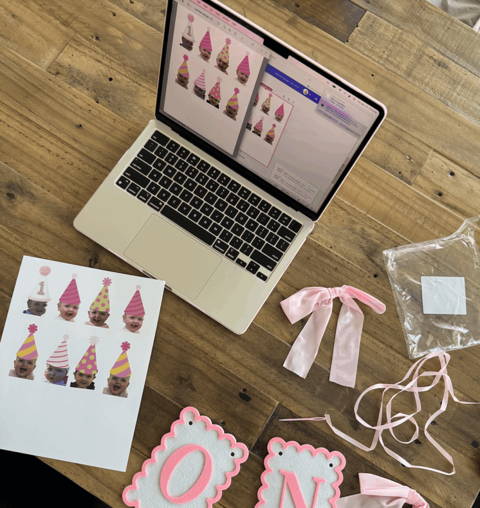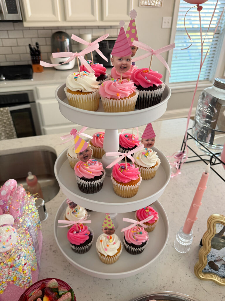 For the cupcake toppers I did a combo of pink ribbons and my daughter’s face with party hats I made in Canva & printed/cut at home. I thought I was ordering cupcake picks with the ribbons but they just came with ribbons, so I ended up hot gluing them to toothpicks and then cutting the tails so they weren’t too long. I got the pink ribbons on SHEIN. And I added cute sprinkles I found at Hobby Lobby! Here are some similar on Amazon.